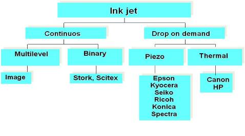 噴墨技術(shù)分為連續(xù)噴墨和按需噴墨(DOD)兩種,前者目前只用在柯達的數(shù)字印刷機上,市場上的絕大部分噴墨打印機都屬于按需噴墨技術(shù),按需噴墨又分為壓電和熱發(fā)泡兩類,熱發(fā)泡噴頭廉價、精度高,但其缺點也是顯而易見的:噴頭壽命短、只適用水性墨水,因之主要用于家庭和辦公室的紙張打印;而壓電噴墨是利用陶瓷加上電壓后會變形的原理,直接將電壓轉(zhuǎn)換為機械壓力,工作在常溫下,也無需溶解在水中的氧氣幫忙,所以不但噴頭壽命長,而且可以適用各種類型溶劑所生產(chǎn)的墨水。
