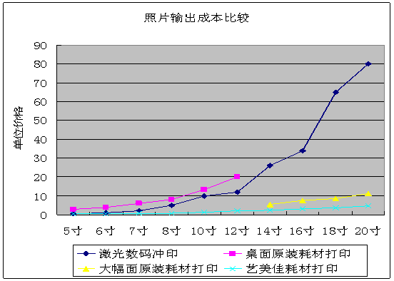 從上圖就可以看出,照片打印機(jī)和基于照片打印的多功能打印機(jī),每年都以30%以上的速度增長(zhǎng),僅美國(guó)市場(chǎng),2005年預(yù)計(jì)裝機(jī)量就達(dá)到2000萬臺(tái)以上,2008年可達(dá)3000多萬臺(tái)。 相比于數(shù)碼激光,照片的噴墨打印輸出至少有如下優(yōu)勢(shì):方便、隨意性強(qiáng):因?yàn)橥耆诩彝?、辦公室實(shí)現(xiàn),可大可小、可多可少,隨時(shí)隨地、隨心所欲。私密性好:用不著將數(shù)碼文件交給別人,也用不著從他人處取回,不想讓人見的,別人永遠(yuǎn)見不到。DIY,樂趣無窮:不管是對(duì)于專業(yè)人士,還是對(duì)于數(shù)碼發(fā)燒友,完全可以陶醉于從拍照、編輯修改到打印輸出的無窮樂趣。環(huán)保:不再用銀鹽等稀缺資源,也擺脫了藥水使用與排放對(duì)于環(huán)境的污染。持久不退色:噴墨打印墨水分為染料和顏料兩大類,如果使用顏料墨水打印出的照片,比傳統(tǒng)的銀鹽感光照片能夠保存更長(zhǎng)的時(shí)間而不退色。 噴墨打印技術(shù)不斷發(fā)展,墨水和打印介質(zhì)品質(zhì)也在不斷提高,從技術(shù)的角度來看,水性顏料墨水+RC間隙型防水高光相紙是照片噴墨的主流方向。不但質(zhì)感、影像品質(zhì)方面毫不遜色于銀鹽感光照片,而且在光線耐牢度、方便性、設(shè)備投入等方面明顯優(yōu)于感光照片。 可能唯一的問題是成本,有的人會(huì)抱怨,噴墨打印的成本高,是的,以EPSON照片級(jí)噴墨打印機(jī),打印在原裝EPSON高質(zhì)量光澤照片紙上為例,打印一張6寸的照片,成本會(huì)在3元以上,而在外面的沖印店里,激光數(shù)碼沖印的報(bào)價(jià)只有一塊左右。定位于專業(yè)應(yīng)用的大幅面打印機(jī)打印(24英寸到44英寸寬)成本會(huì)低很多,因?yàn)樽烂娲蛴C(jī)墨盒中的墨水,平均每毫升價(jià)值10塊人民幣左右,大幅面打印機(jī)墨盒的容量更大,平均每毫升2元上下。從下圖就可以看出,用專業(yè)大幅面打印機(jī)打印照片,成本就已經(jīng)遠(yuǎn)遠(yuǎn)低于激光數(shù)碼沖印的價(jià)格,但是這些打印機(jī)并不是給家庭使用的,像激光數(shù)碼沖印一樣,是給專業(yè)的影像服務(wù)機(jī)構(gòu)使用的。